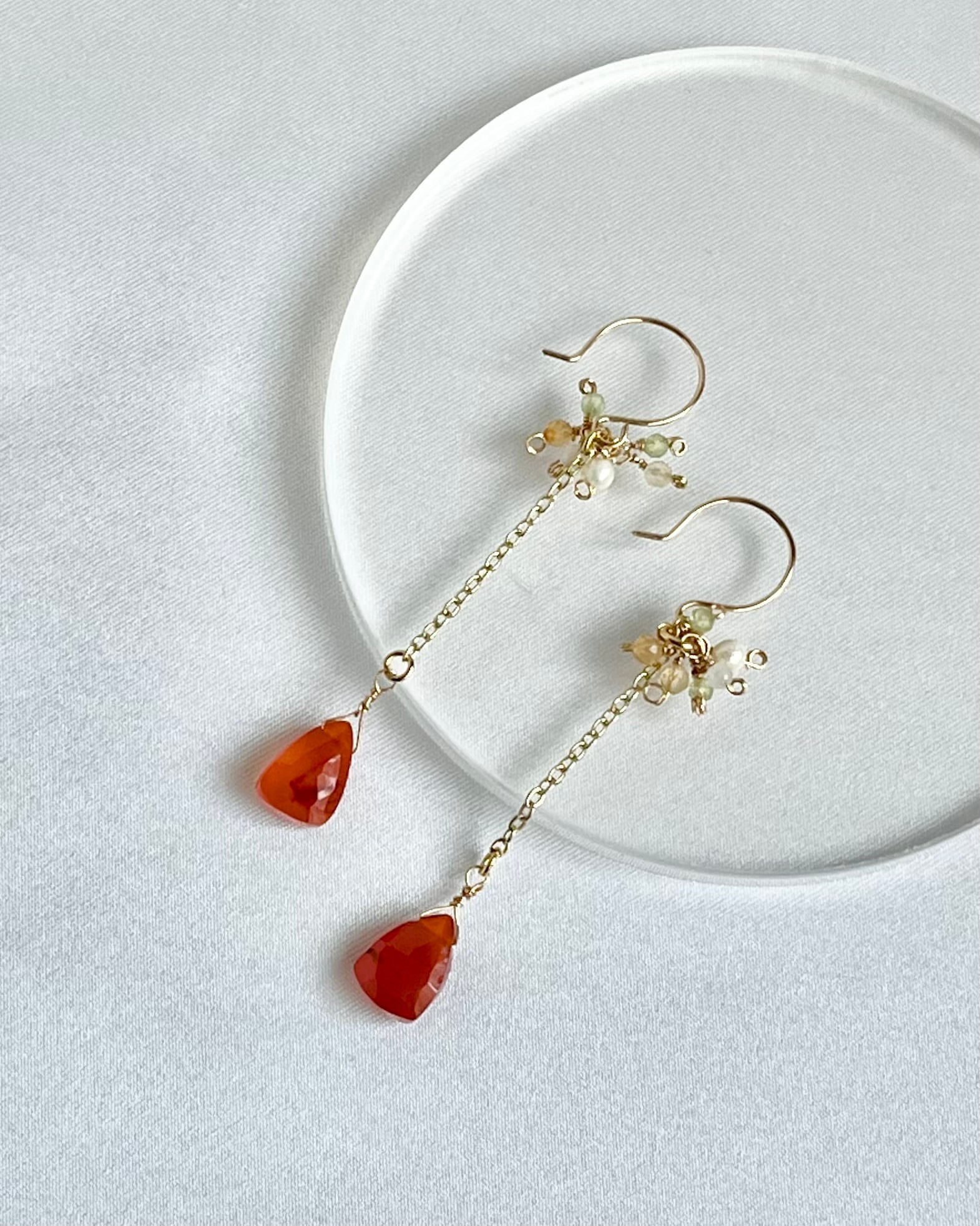 ゴールドチェーンの先で、雫のようにきらめくカーネリアンが、動くたびに表情を変えます。